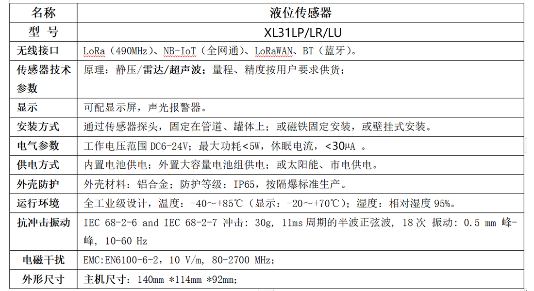 XL31LP智能液位傳感器技術(shù)參數(shù)