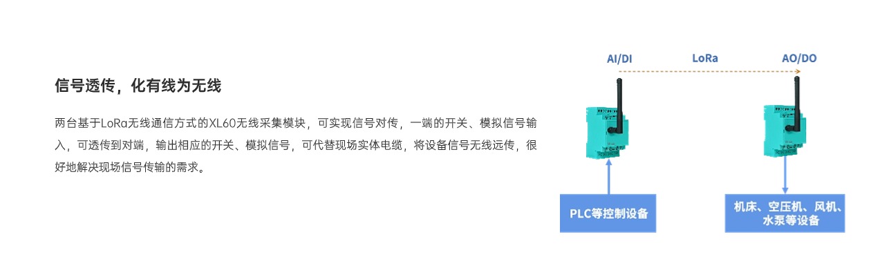 兩臺(tái)XL60采集裝置可實(shí)現(xiàn)信號(hào)對(duì)傳,一端的開關(guān)、模擬信號(hào)輸入,可透?jìng)鞯搅硪欢?,輸出相?yīng)的開關(guān)、模擬信號(hào),很好地解決了現(xiàn)場(chǎng)信號(hào)傳輸?shù)男枨蟆?/span>