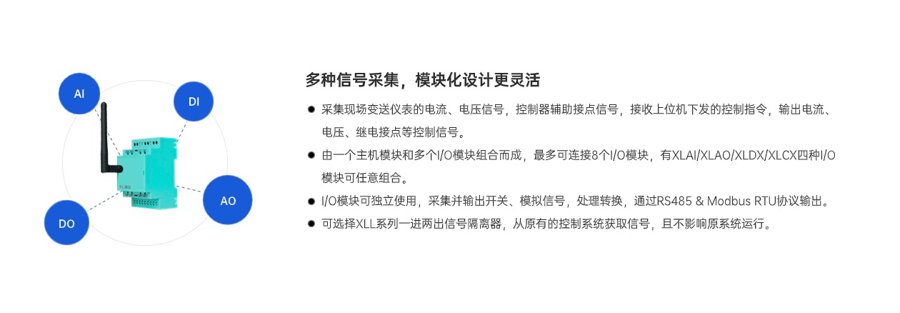 XL60無線采集模塊,采集模擬、開關(guān)信號(hào),輸出模擬、開關(guān)信號(hào),可選多種無線通訊方式。模塊化設(shè)計(jì),更方便擴(kuò)展輸入、輸出數(shù)量。