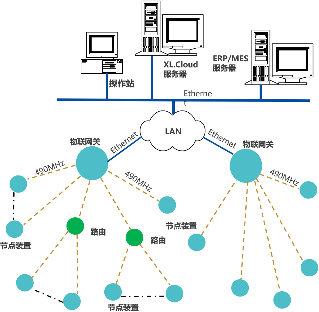 節(jié)點(diǎn)裝置(智能采集裝置/智能采集終端),通過(guò)490MHz上傳數(shù)據(jù)至物聯(lián)網(wǎng)關(guān),網(wǎng)關(guān)通過(guò)Ethernet接入企業(yè)內(nèi)部LAN,推送設(shè)備生產(chǎn)數(shù)據(jù),至企業(yè)生產(chǎn)監(jiān)控平臺(tái)