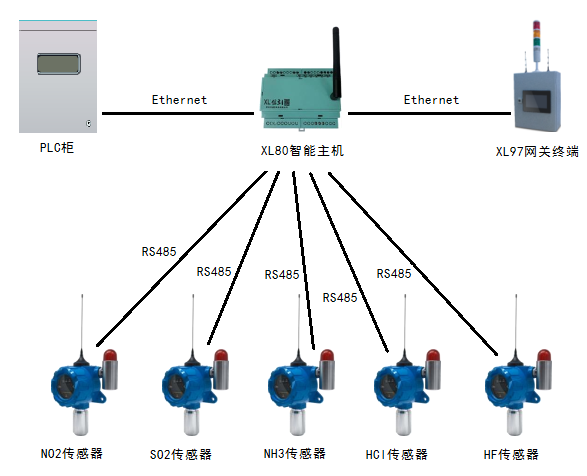 我司廢氣監(jiān)測系統(tǒng),選用XL97網(wǎng)關(guān)終端。通過采用RS485線的方式將各監(jiān)測點的數(shù)據(jù)傳輸至XL80智能主機,智能主機的一個網(wǎng)口通過ETHERNET方式將數(shù)據(jù)轉(zhuǎn)發(fā)給原有PLC系統(tǒng);另一網(wǎng)口通過ETHERNET方式將數(shù)據(jù)上傳至XL97網(wǎng)關(guān)終端,網(wǎng)關(guān)終端將傳來的數(shù)據(jù)進行分析處理后,直觀的將各監(jiān)測點的數(shù)據(jù)實時顯示出來。