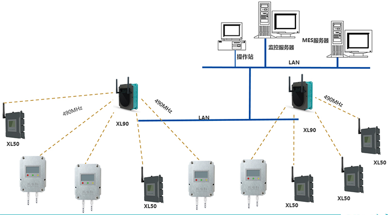 采集節(jié)點(diǎn),通過(guò)490MHz無(wú)線上傳數(shù)據(jù)至物聯(lián)網(wǎng)關(guān),網(wǎng)關(guān)通過(guò)Ethernet,接入LAN,推送數(shù)據(jù)至MES服務(wù)器