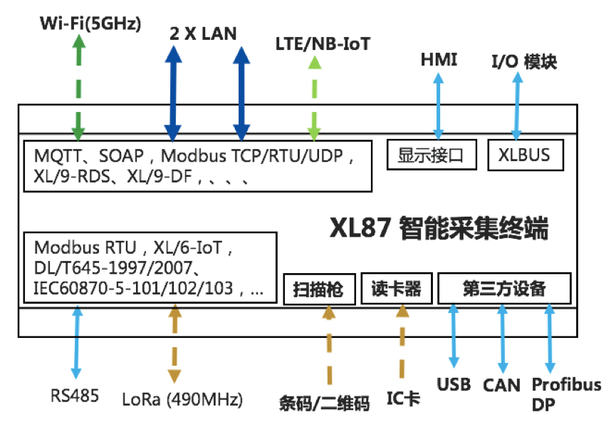 XL87智能采集終端,配置有 DI/AI/DO/AO,Ethernet,LoRa(無線),RS485、CAN、USB等等接口,通過各種功能的傳感器,采集設(shè)備運行工藝數(shù)據(jù);