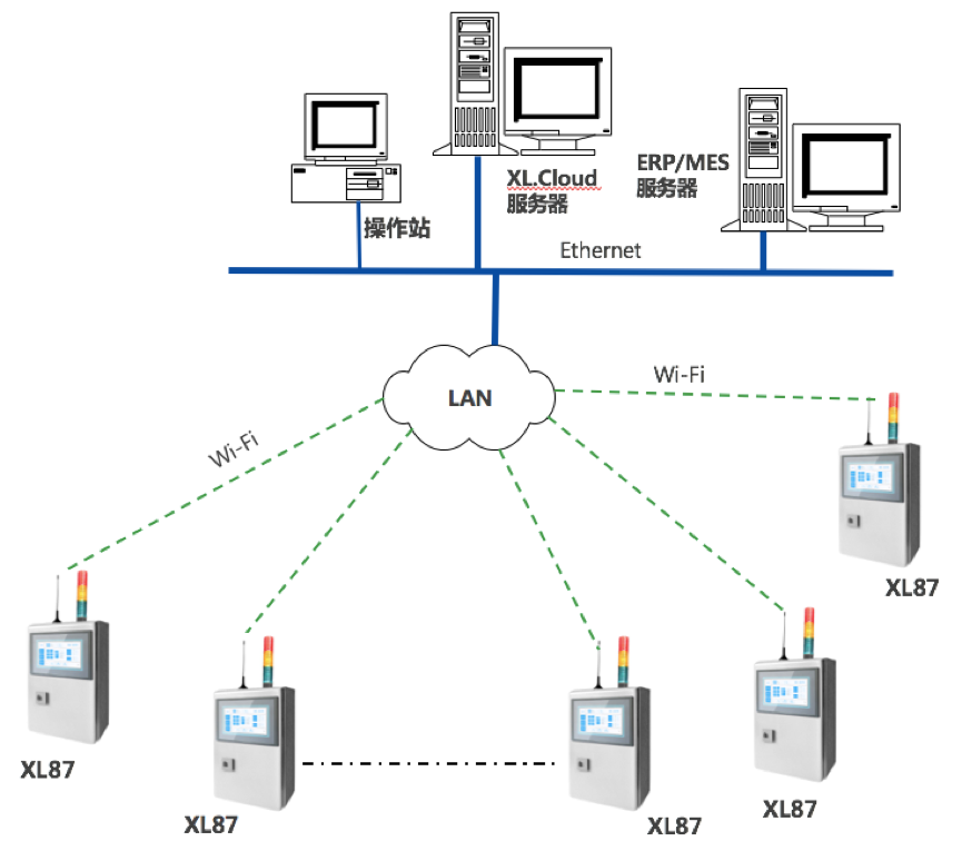 系統(tǒng)由數(shù)據(jù)采集節(jié)點裝置XL87智能采集終端 、Wi-Fi無線通信網(wǎng)絡(luò)、監(jiān)控中心服務(wù)器,及工廠數(shù)字化平臺XL.Cloud軟件構(gòu)成;