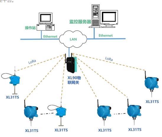 無(wú)線接收端選擇XL90物聯(lián)網(wǎng)關(guān),物聯(lián)網(wǎng)關(guān)無(wú)線讀取溫度傳感器的數(shù)據(jù),進(jìn)行處理、協(xié)議轉(zhuǎn)換,通過(guò)Ethernet上傳數(shù)據(jù)至監(jiān)控服務(wù)器,或接入DCS等其它監(jiān)控平臺(tái)。