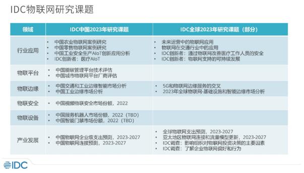 2023年IDC持續(xù)跟進(jìn)物聯(lián)網(wǎng)的研究,圍繞重點(diǎn)行業(yè)應(yīng)用、物聯(lián)平臺(tái)、物聯(lián)邊緣、物聯(lián)安全及物聯(lián)感知新設(shè)備技術(shù)開(kāi)展,具體研究課題如下: