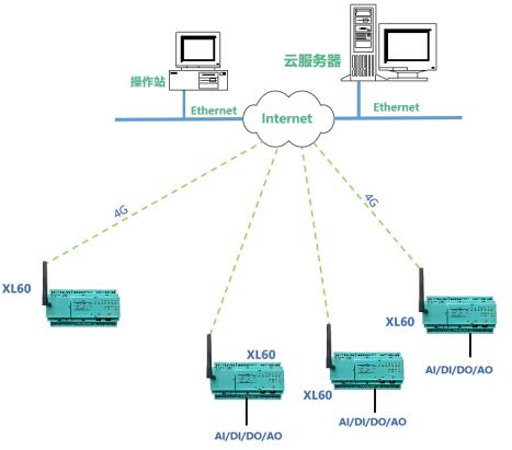 方案三:對于位置偏遠或安裝分散的設備運行參數,如管網、管溝的壓力、溫度、液位、流量、氣體濃度等信號,XL60無線采集裝置可采用4G通信將采集的數據直接上傳至云平臺。
