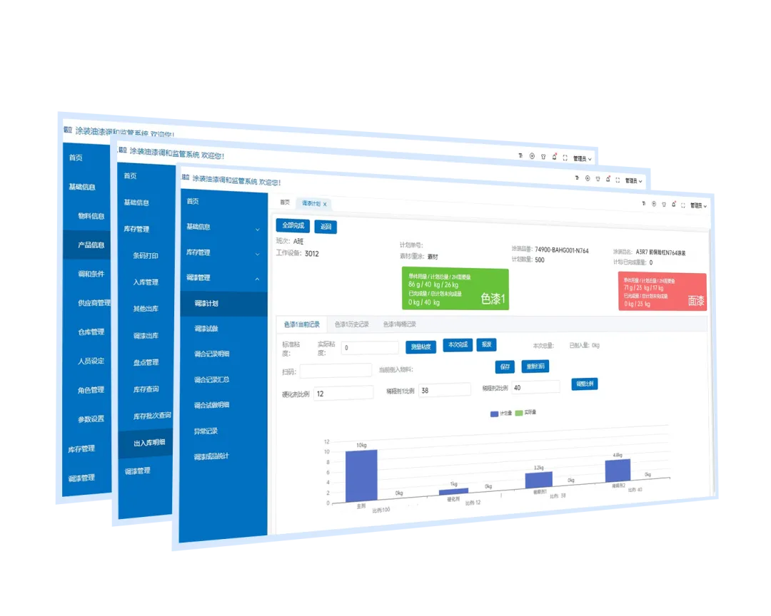 l 平臺自動記錄、生成用戶所需的各類報(bào)表,如調(diào)漆成品統(tǒng)計(jì)、庫存余料盤點(diǎn)等報(bào)表;