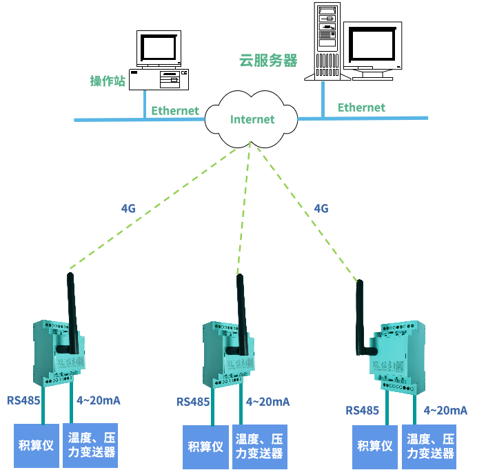 管網(wǎng)上已安裝的流量計、積算儀、壓力變送器、溫度變送器等儀表,由于廠家不同,通信接口可能不統(tǒng)一,選擇XL802通信主機(jī),搭配XLAI模擬量輸入模塊,可同時讀取儀表4~20mA、RS485通信接口的信號,將管道壓力、溫度、瞬時流量、累積流量等關(guān)鍵數(shù)據(jù),無線遠(yuǎn)傳至監(jiān)控平臺。