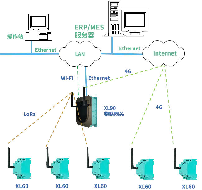 接入企業(yè)監(jiān)控平臺(tái):XL60無線采集模塊采用LoRa無線傳輸數(shù)據(jù)至XL90網(wǎng)關(guān),網(wǎng)關(guān)通過Ethernet/WiFi等方式接入監(jiān)控平臺(tái);