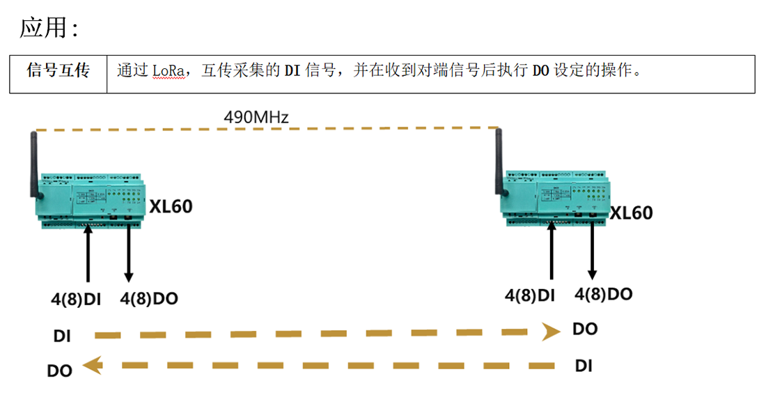 無線開關(guān)量對(duì)傳模塊XL60D,由一對(duì)XL60D采集模塊組成,從一端模塊輸入的開關(guān)信號(hào),無線對(duì)傳到另一端輸出開關(guān)信號(hào)。開關(guān)信號(hào)是一對(duì)一的輸入、輸出,DO隨著對(duì)應(yīng)DI的變化而變化。