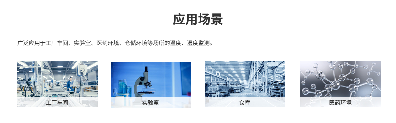 工廠車間、實(shí)驗(yàn)室、醫(yī)藥環(huán)境、倉儲(chǔ)環(huán)境等場所的溫度、濕度監(jiān)測。