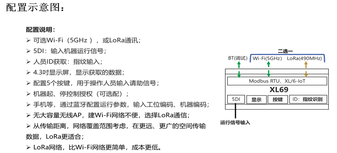 XL69機(jī)臺(tái)監(jiān)控裝置,采集機(jī)臺(tái)、工位人、機(jī)生產(chǎn)運(yùn)行信號(hào):機(jī)器運(yùn)行狀態(tài)、人員ID信息及操作時(shí)間數(shù)據(jù),獲取機(jī)器、人員生產(chǎn)運(yùn)行數(shù)據(jù),并對(duì)機(jī)臺(tái)的運(yùn)行數(shù)據(jù)進(jìn)行邊緣計(jì)算,統(tǒng)計(jì)、分析機(jī)臺(tái)的設(shè)備效率、時(shí)間效率、品質(zhì)效率,及綜合效率。通過(guò)無(wú)線方式,上傳獲取的數(shù)據(jù)。