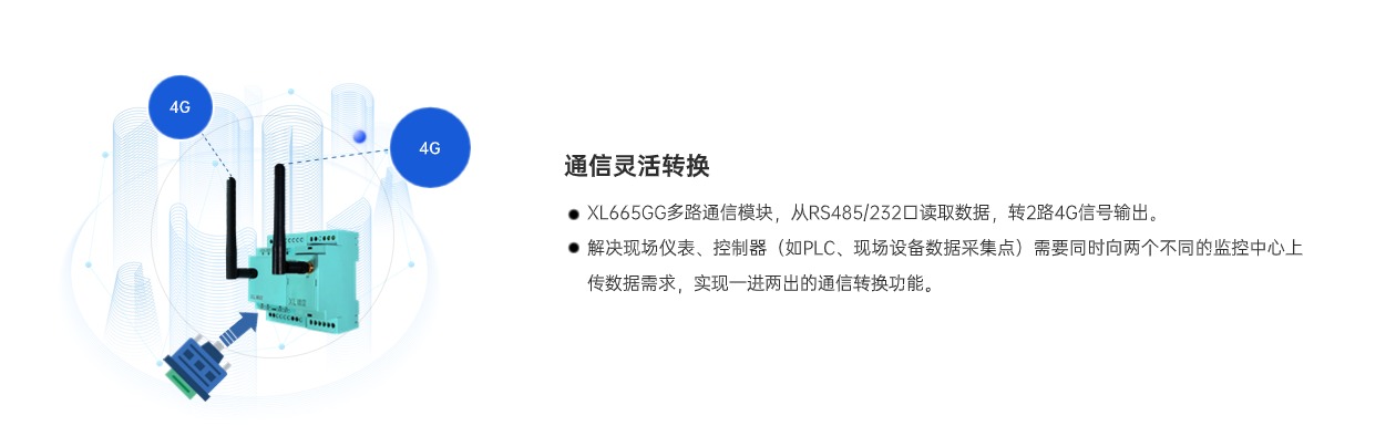 XL665GG多路通信模塊是一款高效靈活的通信轉(zhuǎn)換設(shè)備,可將RS485設(shè)備的一路輸出信號,轉(zhuǎn)為2路4G輸出信號,有效滿足了工控設(shè)備同時將數(shù)據(jù)接入兩個Modbus主站的需求,簡單、方便、易用,成本更低,滿足多種場景需求。