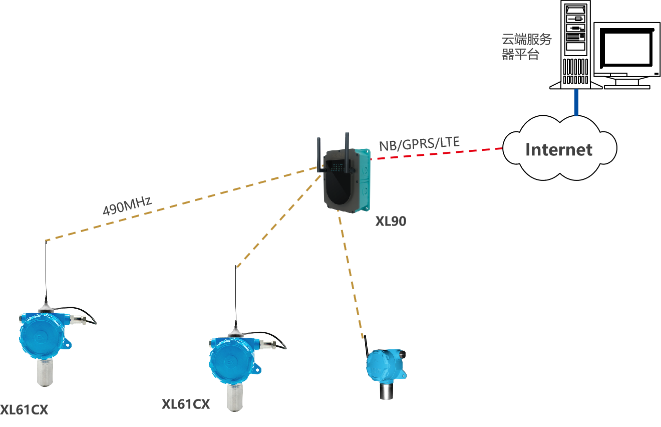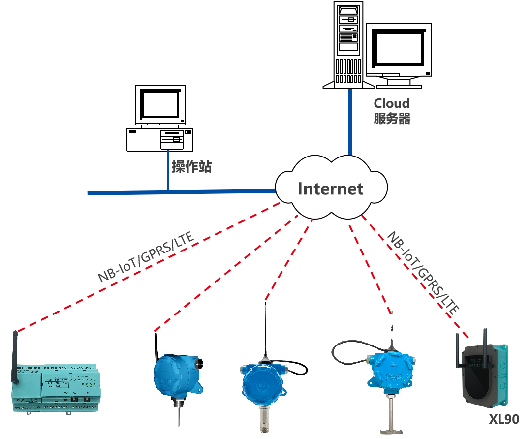 選擇XL90物聯(lián)網(wǎng)關(guān),無(wú)線讀取監(jiān)測(cè)點(diǎn)的數(shù)據(jù),進(jìn)行協(xié)議、通訊轉(zhuǎn)換后,推送至上層軟件平臺(tái)