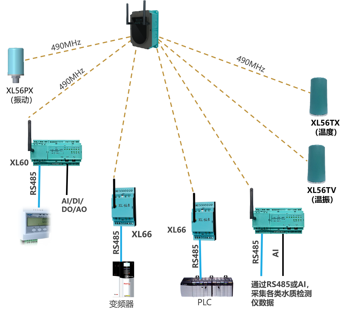 類似泵房、水廠、水源井等場所的數(shù)據(jù)監(jiān)測,監(jiān)測點的數(shù)據(jù)先上傳至XL90物聯(lián)網(wǎng)關(guān),再通過NB/GPRS/LTE轉(zhuǎn)發(fā)數(shù)據(jù)至云平臺,此種情況,數(shù)以后在量大時,可選LTE(4g)方式