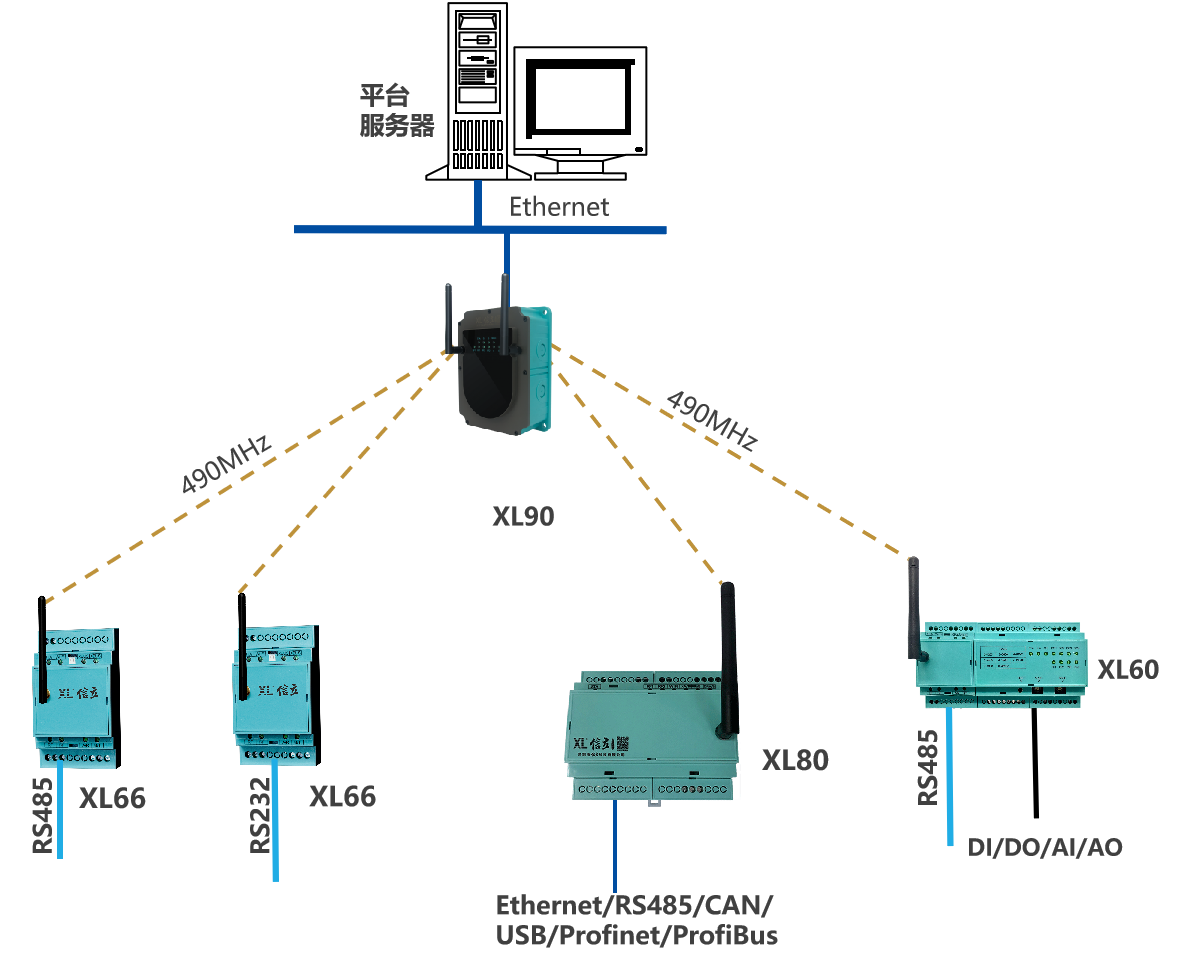 類似泵房、水廠、水源井等場(chǎng)所的數(shù)據(jù)監(jiān)測(cè),監(jiān)測(cè)點(diǎn)的數(shù)據(jù)先上傳至XL90物聯(lián)網(wǎng)關(guān),再通過(guò)NB/GPRS/LTE轉(zhuǎn)發(fā)數(shù)據(jù)至云平臺(tái),此種情況,數(shù)以后在量大時(shí),可選LTE(4g)方式