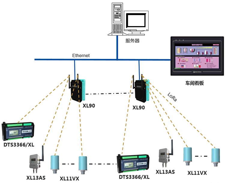 基于XIoT技術(shù)的回流爐運(yùn)行狀態(tài)數(shù)據(jù)集系統(tǒng),選擇DTSD3366/XL電力監(jiān)測儀表,XL13AS無線風(fēng)速傳感器、XL11VX無線振動(dòng)傳感器,采集回流爐運(yùn)行數(shù)據(jù),無線上傳數(shù)據(jù)至XL90物聯(lián)網(wǎng)關(guān):