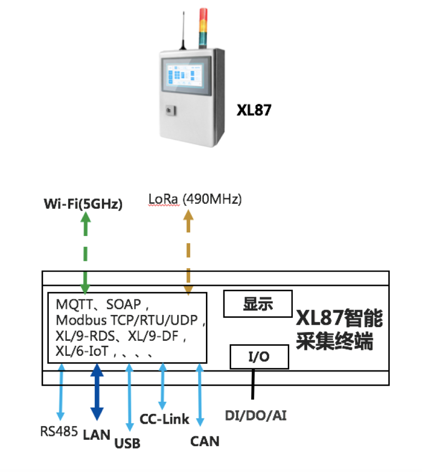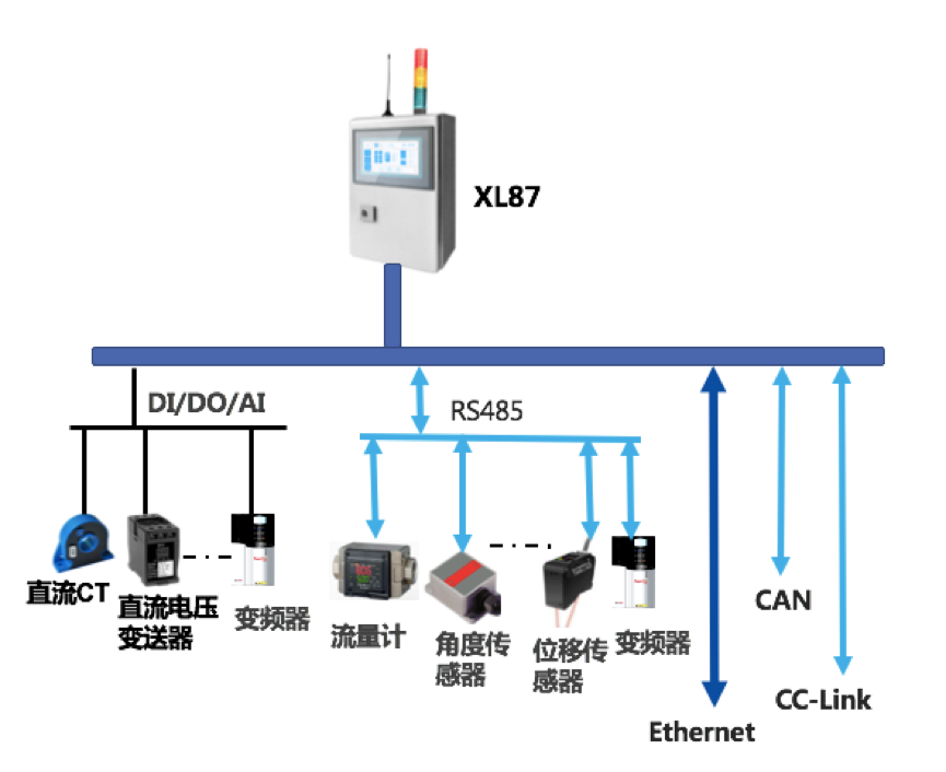 XL87智能采集終端,配置有 DI/AI/DO/AO,Ethernet,LoRa(無線),RS485、CAN、USB等等接口,通過各種功能的傳感器,采集設(shè)備運行工藝數(shù)據(jù);