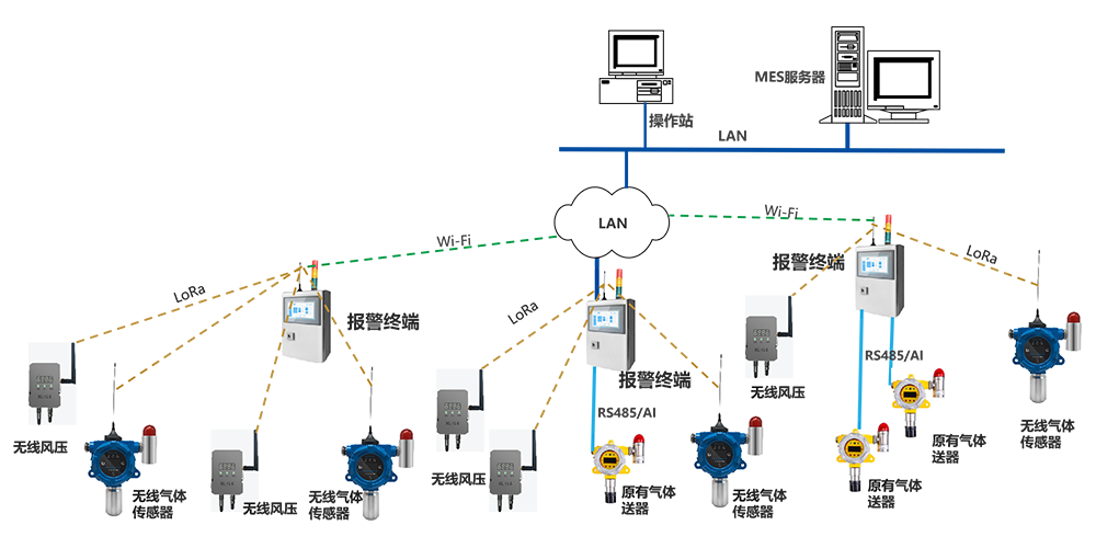 原有的氣體傳感器,通過有線方式接入分布安裝的報(bào)警終端;支持RS485、DC4-20mA、DC0-5V、Ethernet等方式接入。