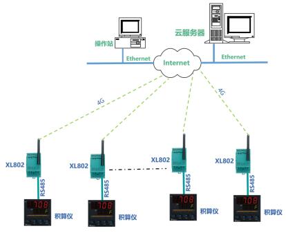 在每一個(gè)管網(wǎng)監(jiān)測(cè)點(diǎn),安裝1臺(tái)XL802無(wú)線通信主機(jī),通信主機(jī)通過(guò)RS485口讀取積算儀的數(shù)據(jù),經(jīng)過(guò)協(xié)議轉(zhuǎn)換,通過(guò)全網(wǎng)通4G,上傳數(shù)據(jù)至云服務(wù)器。