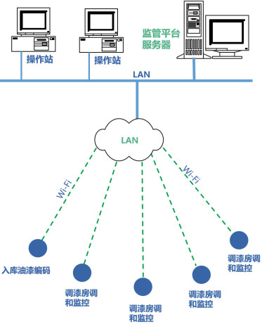 涂裝油漆調(diào)和監(jiān)管系統(tǒng),由監(jiān)管平臺(tái)服務(wù)器、油漆調(diào)和操作監(jiān)控終端、電子秤、油漆編碼終端、操作站等構(gòu)成,通過工廠內(nèi)的局域網(wǎng)(WI-FI)進(jìn)行通信連接。