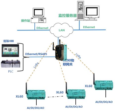 方案一:XL60無線采集裝置采集的現(xiàn)場設備數據,采用LoRa無線傳輸方式,傳輸至XL90物聯(lián)網關,經協(xié)議轉換后將數據通過Ethernet或RS485上傳至監(jiān)控平臺、PLC、觸摸屏、控制器等設備。