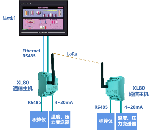 在采集壓力變送器、積算儀等儀表信號的同時,通過LoRa無線讀取其他采集點(diǎn)的數(shù)據(jù),通過以太網(wǎng)或RS485接入現(xiàn)場觸摸屏、數(shù)顯表等顯示設(shè)備,實(shí)時展示當(dāng)前管道運(yùn)行數(shù)據(jù)。